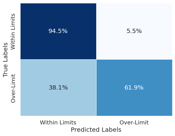 The model achieved an F1-Score of 0.63 greatly beating our previously set base line and success criteria of 0.128. The model performed better at identifying the majority class (credit card balance within limits) as seen in Figure 7.