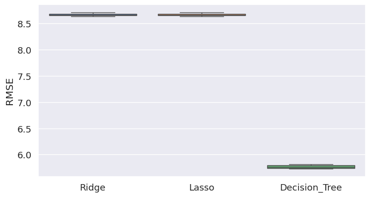With only 18 features initially, no feature removal step was conducted. Instead, the tuning focused on the regularization parameters for the linear models and the decision tree’s depth and minimum samples for a leaf split to counteract overfitting. Hyperparameter tuning was executed using the Ray-Tune library with the Optuna algorithm. The models with specific parameter sets were validated through 5-fold cross-validation, utilizing RMSE as the evaluation metric.