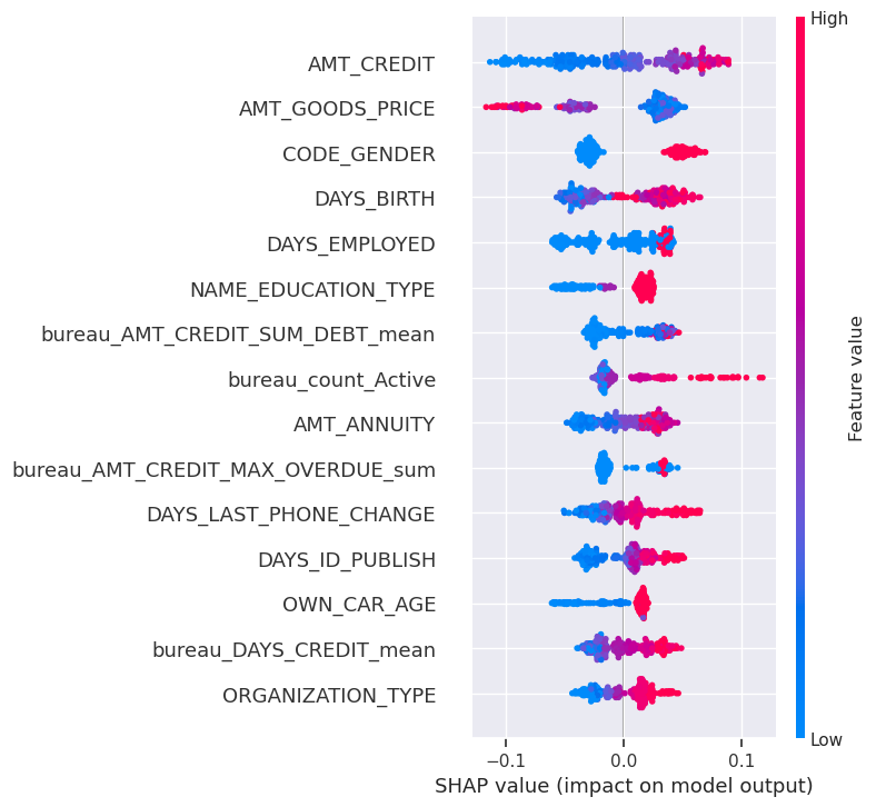 Figure 6: Shap Value bee swarm plot for a subset of 300 samples from the test set. Positive probability values impact applications with default risk.