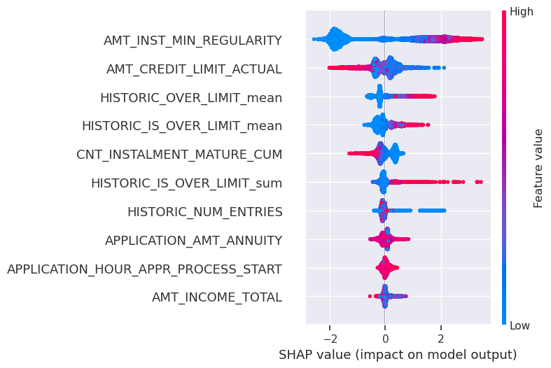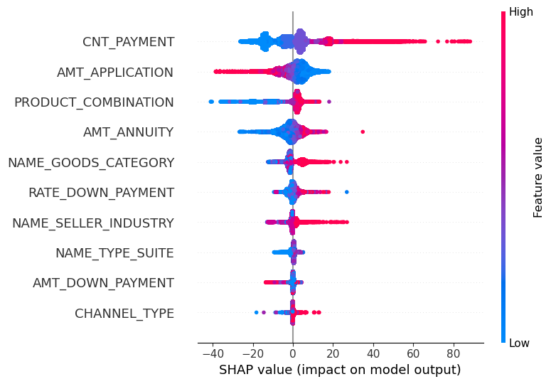 Figure 11: Shap value analysis of the ten most valuable features in the consumer loan prediction model.