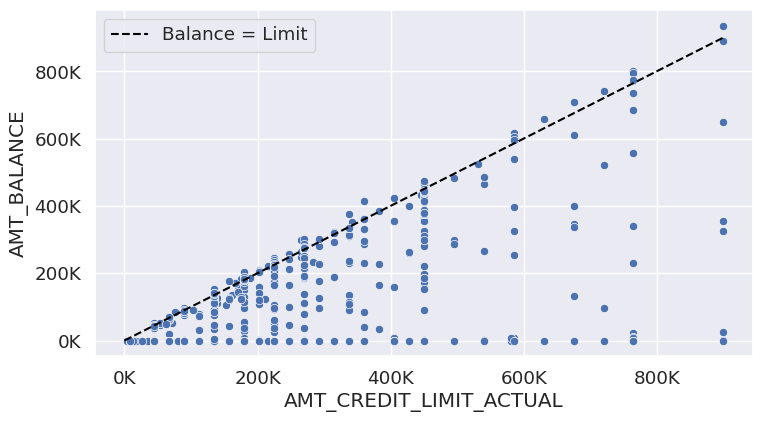 Figure 2: Credit card balance versus credit card limit for a random sample of n=1000. Points higher on the y-axis than the black line signify credit-cards over limit.