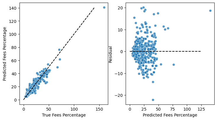 The decision tree model achieved an RMSE value of 5.70, surpassing our baseline of 13.06. The model exhibited consistent performance across the target value spectrum, as depicted in Figure 10, and the mean of the residuals was approximately 0. This indicates that the model performed well in predicting loan fees and produced residuals with a balanced distribution around zero.